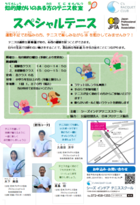 知的障がいのある方のテニス教室 受付中 開催日 毎月最終日曜日 開催時間 14時~14時50分(経験者) 15時~15時50分(未経験者) 対象 小学5年生以上 定員 各6名 参加費 1名1,870円 お申し込み ツイート