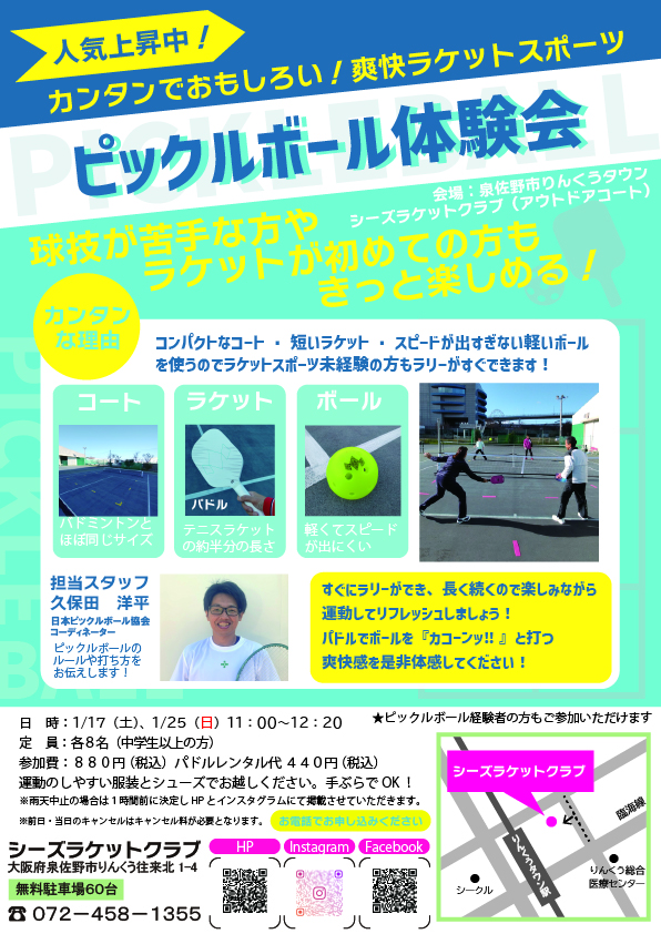 ピックルボール体験会 受付中 開催日 1月17日(土) 1月25日(日) 開催時間 11:00~12:20 対象 中学生以上の方(スクール生以外の方も参加可能) ※ピックルボール経験者の方もご参加いただけます。 定員 各8名 参加費 880円(税込)+パドルレンタル代440円(税込) お申し込み ツイート