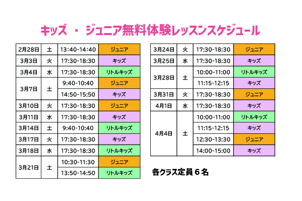春休みキッズ・ジュニア無料体験レッスン 受付中 お電話でも受付中です。 シーズラケットクラブ 072-458-1355 開催日 2/28(土)~4/4(土) 対象 4歳から新小学6年生のお子様 お申し込み ツイート