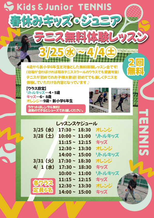 春休みキッズ・ジュニア無料体験レッスン 受付中 お電話でも受付中です。 シーズラケットクラブ 072-458-1355 開催日 3/25㈬~4/4㈯ 対象 4歳から新小学6年生のお子様 お申し込み ツイート
