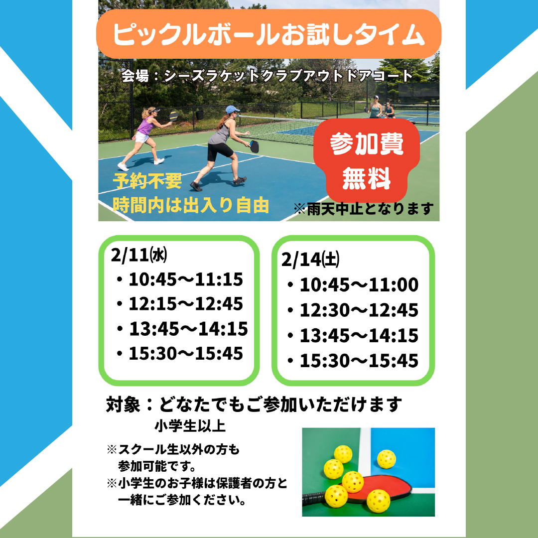 ピックルボールお試しタイム 準備中 開催日 2/11(水・祝)、2/14(土) 対象 どなたでもご参加いただけます(小学生以上) ※スクール生以外の方も参加可能 ※小学生のお子様は保護者と一緒にご参加ください。 参加費 無料 ツイート