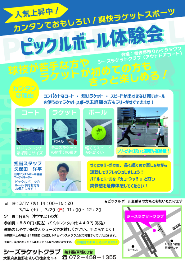 ピックルボール体験会 受付中 開催日 3月14日(土)、3月17日(火)、3月29日(日) 対象 中学生以上の方ならどなたでもご参加いただけます(2回目以降の参加やピックルボールの経験がある方も参加可能です) 定員 各回8名 参加費 1名880円(税込)パドルレンタル代440円(税込) お申し込み ツイート