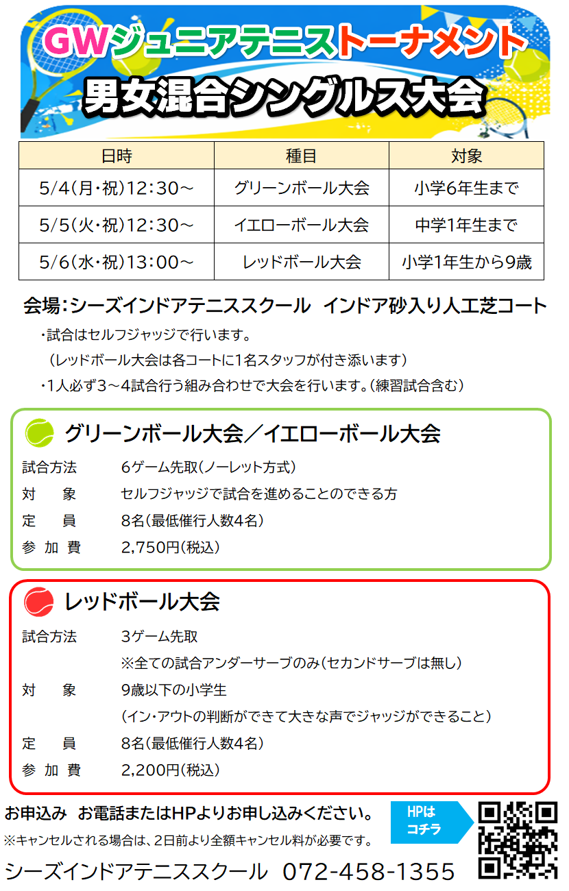 GWジュニアテニストーナメント(レッド・グリーン・イエロー) 受付中 お申し込みフォームの【その他】欄にレッドボール大会・グリーンボール大会・イエローボール大会のいずれか参加希望の種目を記入してお申し込みください。 お申し込み ツイート
