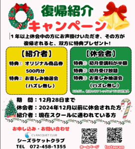 2025.09.02 秋のご入会、ご紹介キャンペーン 募集期間 9月15日~11月末日 キャンペーン特典 ご入会特典 ①入会金(5,500円)無料 ②初月レッスン受講料半額+初月レッスン受け放題 ➂ラケット、シューズ、スクールギフト3,000円のうち1点プレゼント ➃おたのしみ抽選(はずれなし) ご紹介特典 ①スクールギフト券500円 ②おたのしみ抽選(はずれなし) キャンペーンお申し込みはこちら TEl 072-458-1355 お申し込み ツイート