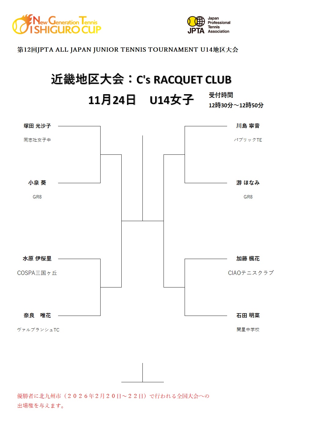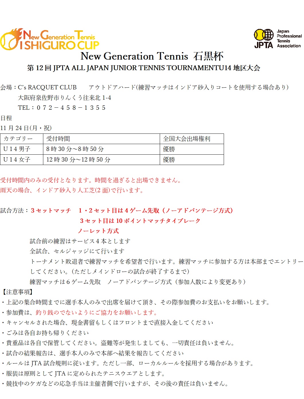 第12回JPTA ALL JAPAN JUNIOR TENNIS TOURNAMENTU14地区大会ドロー及注意事項