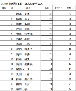 2026.02.16 お知らせ 2月15日(日)みんなでテニスの結果報告 みんなでテニス開催されました。 優勝が松本 克也さん 準優勝が吉岡 一郎さん 三位が石塚 泰雄さん となりました。おめでとうございます。 ツイート